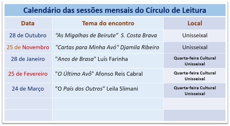 Estão também já programadas as próximas sessões, para que possam ter tempo para ler. Assim, podem desde já agendar as próximas sessões para as  quartas feiras culturais: